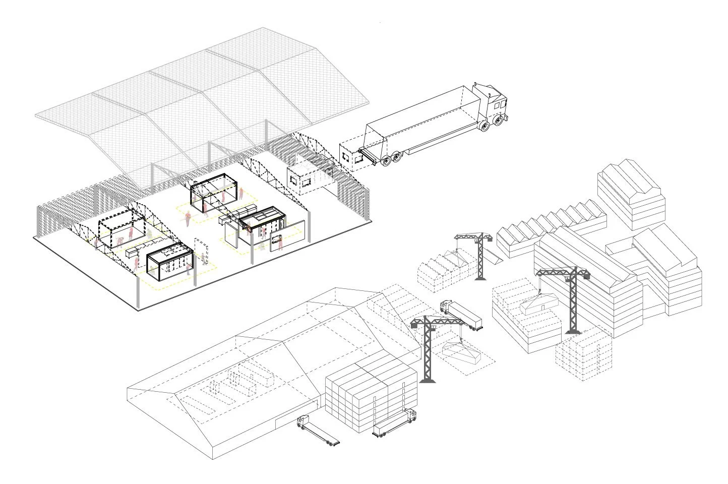 astudio's design of the modular building system can reduce programme length by 50% (saving over 75% in building time). The modular building system offers many advantages such as: the ability to deliver top quality materials at reduced cost, constant quality control, excellent finishing, and embedded sustainability.