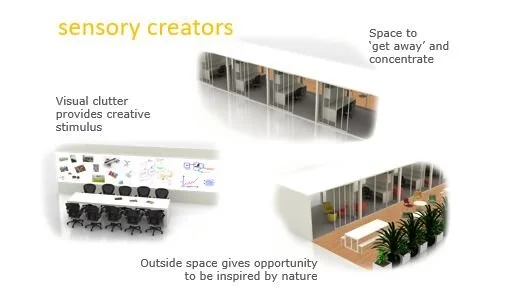 Change agents need high energy and freedom to roam whilst sensory creators need lots of stimulus and space to concentrate…